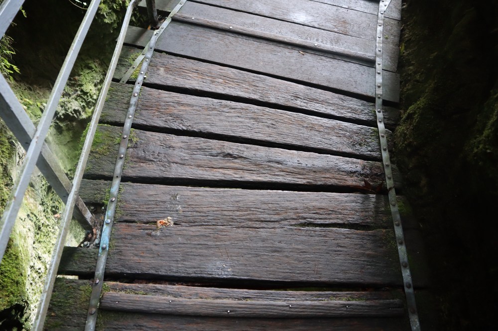 Stop..palkki loppui ja laudat ovat vain reunoissa kiinni, lautojen välistä näet korkean pudotuksen..heikottaa ja tuntuu että happi loppuu. On pakko pysähtyä hengittämään. Taisi siinä muutama valittu sana päästä suustani, kun päivittelin tyhmyyttäni, miksi pitää lähteä kiusaamaan itseään tänne saakka ja suurinpiirtein luin jo testamenttia ääneen, siinä samalla kun näin jo iltalehtien uutiset silmissäni ”suomalaispariskunta joutunut rotkoreitti onnettomuuteen”.