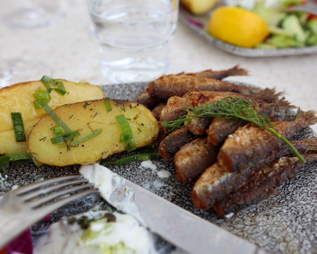 Sitten nälkä alkoi kurnia suonissa ja suuntasimme Sokos Hotel:n ravintolaan, joka sijaitsi siinä torin kulmalla ja josta oli todella hulppeat näkymät satamaan. Ruuaksi tilasimme paikan pravuurin eli paistettuja muikkuja ja perunoita. Nyt kyllä täytyy myöntää, että en varsinaisesti ola mikään muikkujen suursyöjä/ystävä, mutta tämän jälkeen olen, sillä ruoka oli aivan taivaallista ja valkoviini kyytipoikana täydensi makuelämystä. Vatsat kylläisenä saatoimme jatkaa kierrostamme eteenpäin.