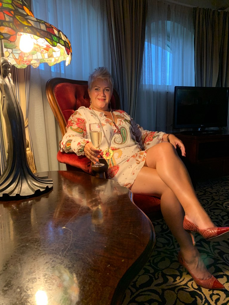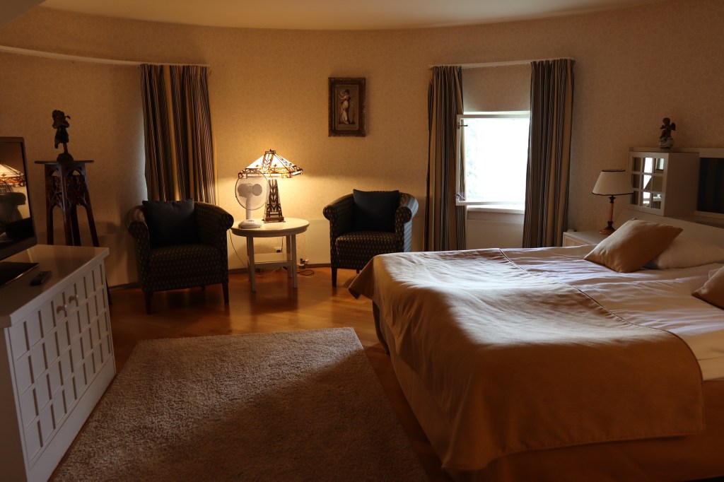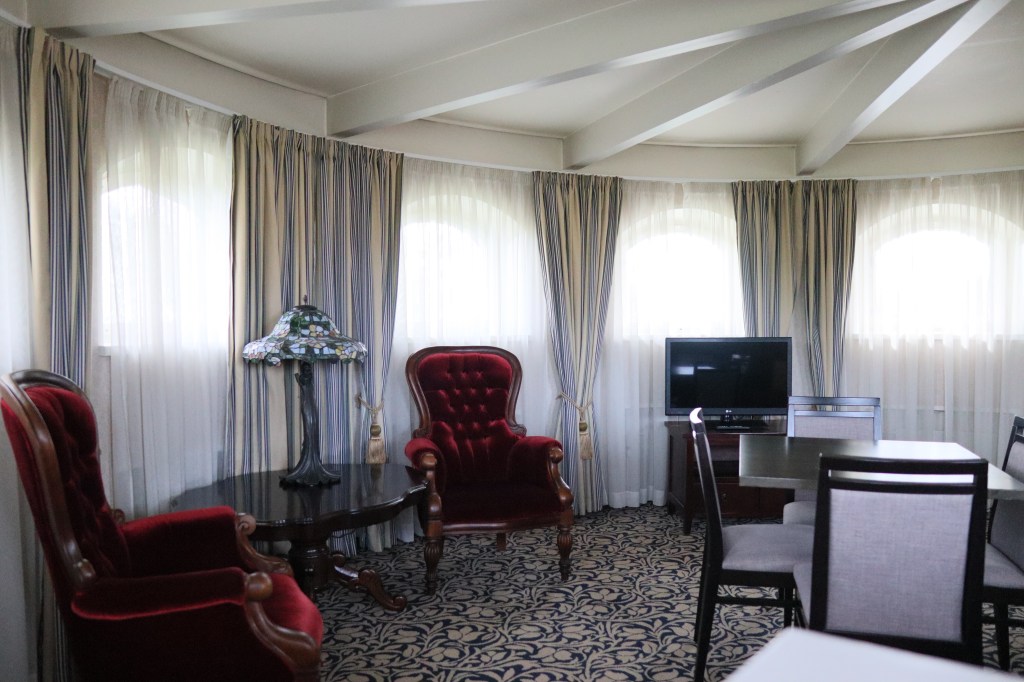 Itse sviitti oli hieno ja siellä oli vanhoja kalusteita kuten tuleekin olla ja yleisilme siisti ja asiallinen. Huoneisto oli kaksikerroksinen ja yläkerran seurustelutilassa istuessamme ja kuohuviiniä siemallessamme, aistimme sen, että täällä on Suomen ja muunkin maan päättäjät varmasti viettäneet aikaa keskustellen ja ilakoiden.
