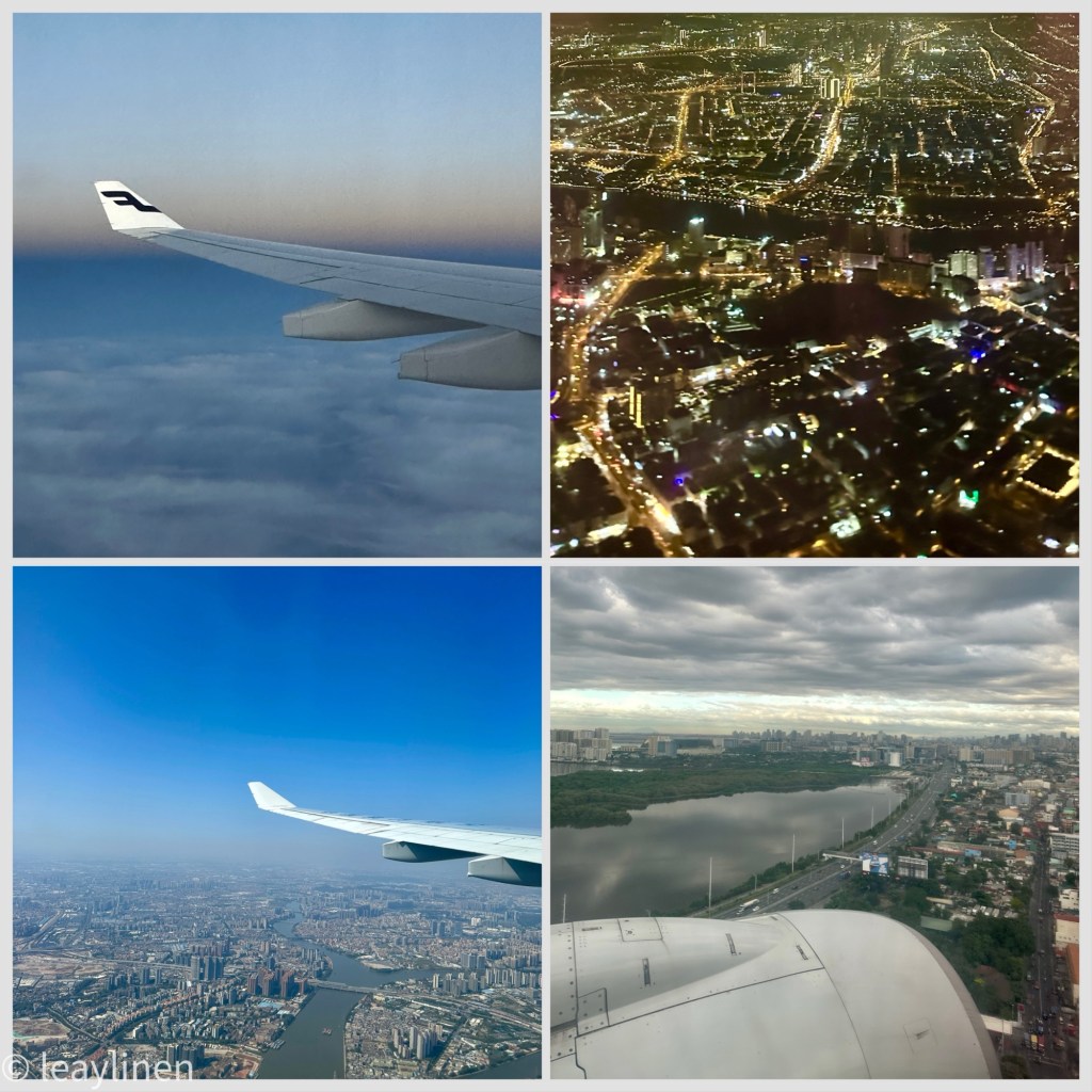 Matka alkoi kolmen pompun kautta kohti Manilaa: Helsinki – Dubai – Kanton – Manila. Liput oli kahdessa osassa, ja hommattu Seat24:n kautta: ensin Helsinki–Dubai ja sitten Dubai–Kanton–Manila. Dubaissa vaihtoaikaa oli reilu tunti ja Kantonissa 2 tuntia 40 minuuttia – ei siis hirveästi ylimääräistä.